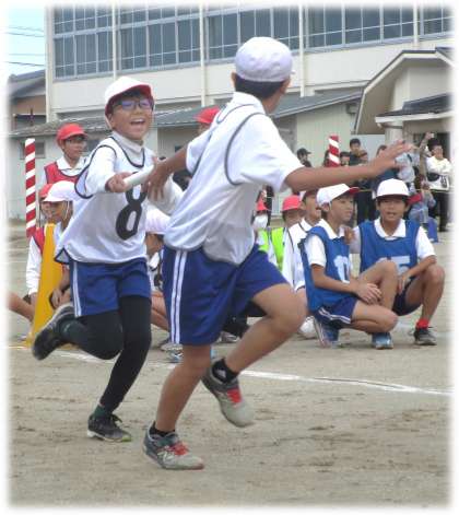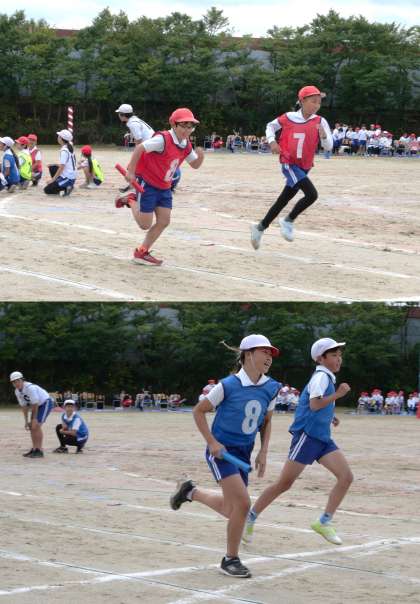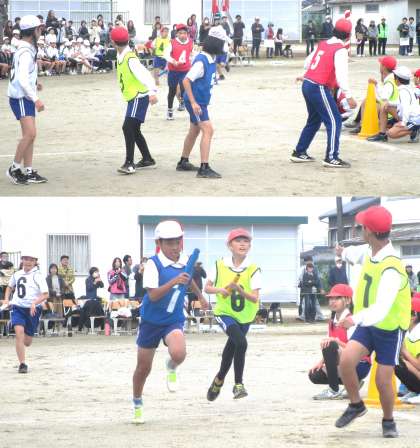 5・6年生のリレーです。全員でバトンをつなぎ、走り切るという思いをつないでいきます。