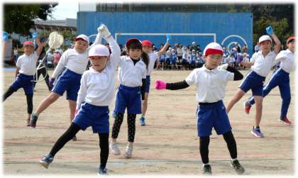 【運動会29】1・2年生 たくさん入れ!ジャンボリー玉入れ3 公開日 2025/11/05 更新日 2025/11/05 学校行事 応援席でも、1・2年生と一緒にジャンボリーミッキーを踊る子どもたち。会場が一体となりました。 1年生 2年生 5678組 行事