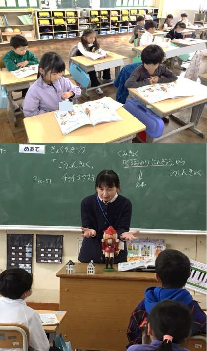 (写真下)1年2組 音楽科:鑑賞の授業です。くるみ割り人形の楽曲を聴きながら、どのような楽器が使われているか考えていました。初めて知る楽器もあり、教科書の挿し絵を見ながら興味津々です。また、担任が用意した本物のクルミ割り人形を見て、硬いクルミを割る人形に、こちらもまた興味津々です。