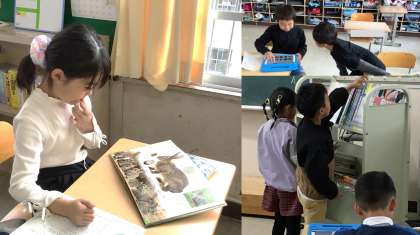 (写真上)2年1組 国語科:ビーバーの大工事の学習を通して、ビーバーのいろいろな秘密を探った子どもたち。自分でも興味をもった動物の秘密を紹介したいと、調べ学習を始めていました。図鑑や学習用タブレットを使いながら、大事な言葉を抜き出し、紹介カードづくりを進めています。