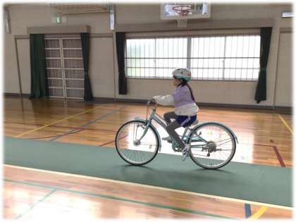 自転車の安全な乗り方を理解し、自分の生活に生かしていくていくため、自転車教室で学びました。交通指導員の方から、改めて自転車に乗るときの交通ルールやマナーを教えていただき、後半では、実際に道路に見立てた体育館内を安全に走行する練習を行いました。自転車教室で学んだことを本当の力にしていくために、ぜひこれから自転車に乗るときに意識していきたいですね。