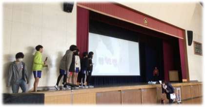 生活委員会からは、日常の廊下歩行やトイレのスリッパの整頓の様子について、劇や映像で「危なくないか」「次の人も気持ちよく使える状態になっているか」など、全校へ考えてもらう投げかけを行っていました。