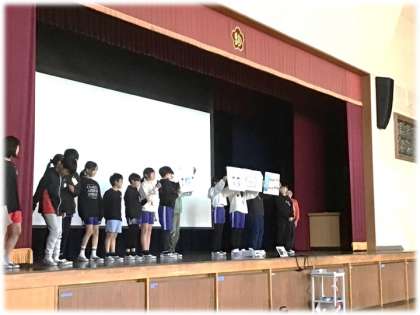 今朝は、児童集会を行い、生活委員会と体育委員会の発表がありました。