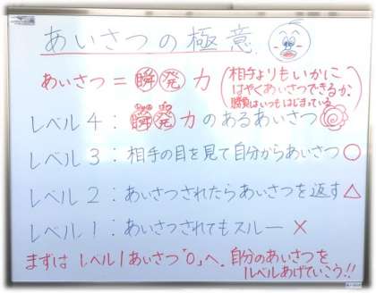 6年生フロアの廊下を歩いていると、積極的に6年生から「おはようございます」「こんにちは」と、あいさつを交わす心地よい声が聞こえてきます。6年2組前のホワイトボードにその秘密がありました。