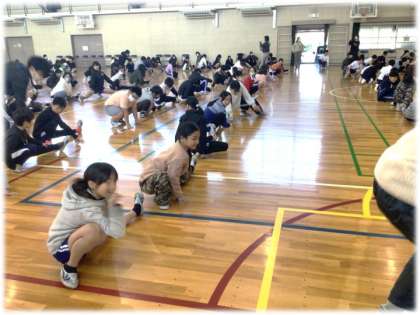 そして、ストレッチにはじまり、多様な動きを体験しました。日頃、体育の授業で行う準備運動の屈伸や伸脚なども、意識するとよいポイントを教えていただき、子どもたちは楽しみながら体を動かしました。
