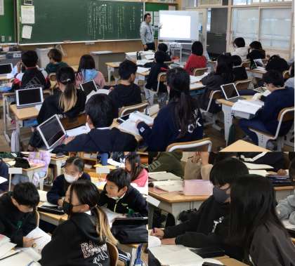 (写真下)5年2組 国語科:同じく、単元「和の文化を受け継ぐ」の学習を進めています。教材文とインタビュー記事を読み比べて、相違点について考え合っていました。