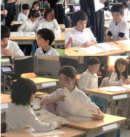 段落の中で中心となる大事な言葉や文を見つけて、理由を含めて全体で共有していきます。本時では、「自然にあるもののよさを生かした接着剤」ということもあり、「初めて知ってびっくりした」「自分でも作ってみたい」「昔のものが今も使われているなんてすごい」など、驚きや感動の思いも飛び交いました。そして、全体で大事な言葉や文を出し合っていくと、黒板上にキーワードが焦点化されていきました。次の時間に行う要約に向けて組み立てメモを作成して授業終了です。振り返りでは、「前よりも大事な言葉を見つけられるようになった」「組み立てメモに大事な言葉や文章を入れられた。次の要約もがんばりたい」と、説明文の読み取りに自信と意欲を高めている姿が見られました。