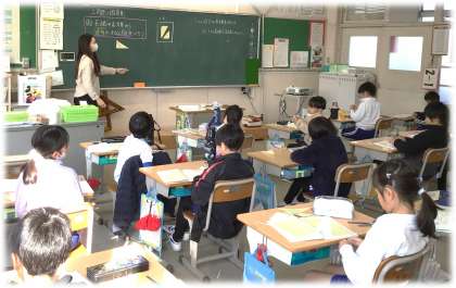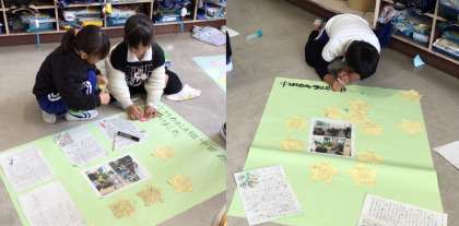 (写真中)2年2組 生活科:町探検で見つけたすてきな学区の秘密をもっと広めたいと発信の準備をしています。グループごとに模造紙に伝えたいことをまとめたり、見やすいようにレイアウトを考えたりしています。