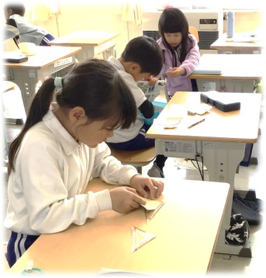 (写真下)2年3組 算数科:紙を折ってできた角のかたちが本当に直角になっているのかを三角定規を当てて確認しています。その後、教科書やノートの角も調べていました。