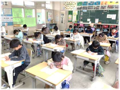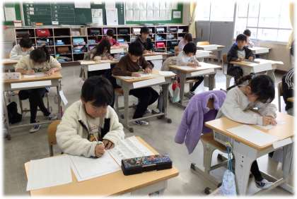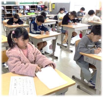 1月7日(水)2年生 書き初め大会の様子 公開日 2026/01/07 更新日 2026/01/07 各学年から 2年生の書き初め大会の様子です。 (写真上)2年1組 (写真中)2年2組 (写真下)2年3組 2年生