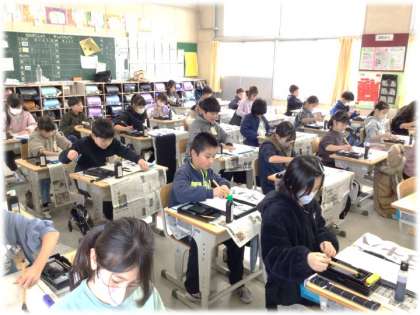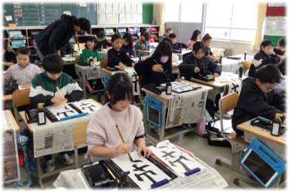 3年生の書き初め大会の様子です。 (写真上)3年1組 (写真下)3年2組