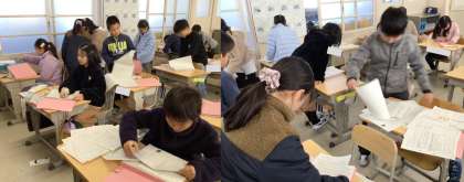 (写真上)3年1組 国語科:これまで学習してきた単元の学習プリントをファイルに綴じています。膨らんだファイルを見て、「こんなに学習してきたんだなあ」とつぶやく3年生。改めて、自分たちの学習してきた軌跡を感じ取っている姿でした。