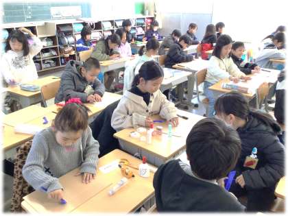 (写真中・下)3年2組 図画工作科:段ボール紙にへらを押しあてたり、すべらせたりしながらできる様々な模様を楽しみながら作っていました。「波のようになった」「へらの広い部分と先の部分を組み合わせたら、風が吹いているような感じになった」など、いろいろと試しながら、自分なりの表現を見つけていました。