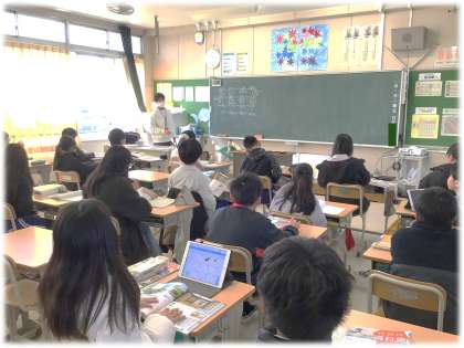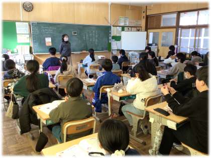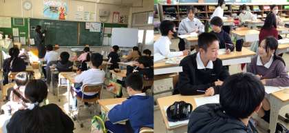 (写真上)6年1組 国語科:外来語、漢語、和語の違いについて、これまでの学習を生かしながら整理していました。文字の世界は奥深いですね。