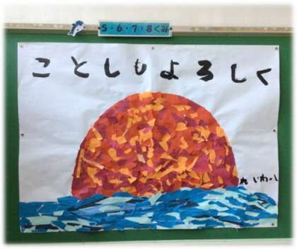 5・6・7・8組の掲示板には、新春にふさわしいすてきな作品が登場しました。画用紙の色合いを工夫しながら、海から昇る初日の出を制作したものです。2026年の駒場っ子の輝かしい姿を象徴しているかのようで、見ていると心があたたかくなるとともに、期待感が高まってきます。