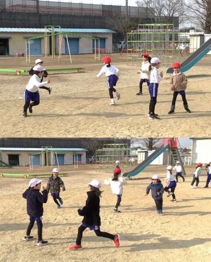 (写真上)1年1組 体育科:ウォーミングアップの一環として、「こおりおに」を行っていました。全力でおに役の児童から逃げたり、タッチされて凍った仲間を助けたりと、時間内にめいいっぱい体を動かしています。