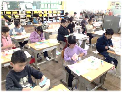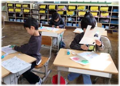 (写真中・下)1年2組 図画工作科:壁や床の模様を写しとるために色鉛筆でこすり出しをした用紙を用いて、「ロボットとぼく・わたし」の作品づくりに取り組んでいます。いろいろなポーズのロボットが出来上がってきて、完成が楽しみです。