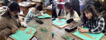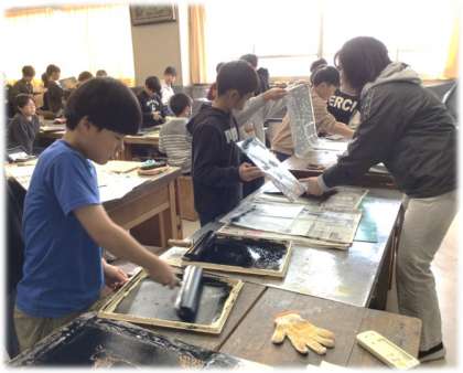 (写真中・下)4年2組 図画工作科:木版画に取り組んでいます。黒色で刷ったときをイメージしながら彫り進めたり、刷った後に再度彫り直したりしています。自分の木版画に熱心に取り組む熱気が感じられる教室でした。
