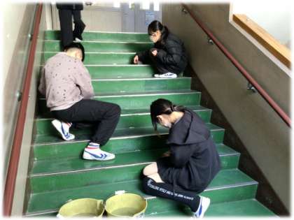 休み時間に、南校舎階段で熱心に階段掃除に取り組んでいる6年生がいます。「来週は、入学説明会があるので」と、新1年生を気持ちよく迎えるために、階段についた汚れを一生懸命にとってくれています。自分の時間をこうして誰かのために使っている姿、心がふるえます。本当に、6年生のみなさん、ありがとう!