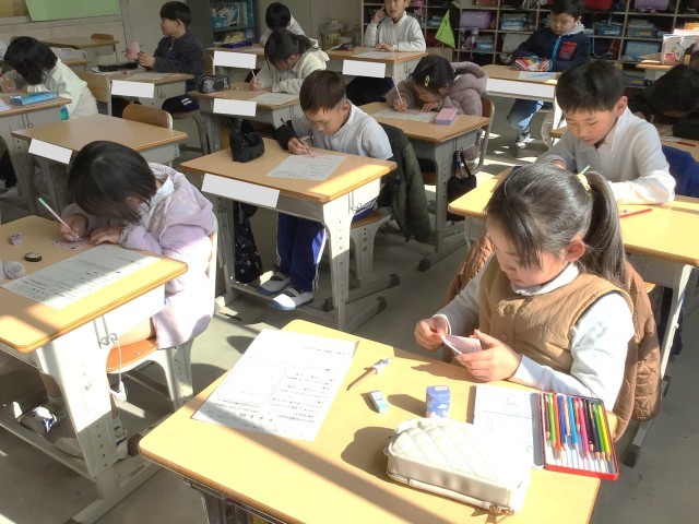 2年生の教室では、早速「ありがとう」カードに、周りの人たちのよさを見つけ、心をこめて書いている姿がありました。本当に見つけ名人の子どもたち。自分を取り巻く人たちの温かさに気付くことができる人もまた、心がぽかぽかですね。真剣にカードを書くまなざしがとてもハートフル!!