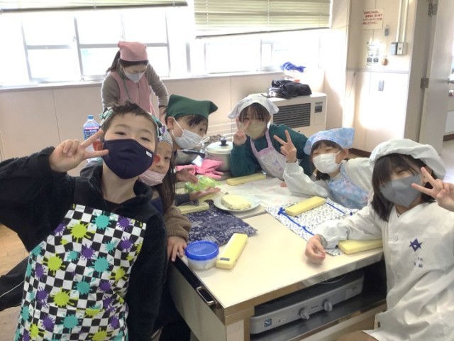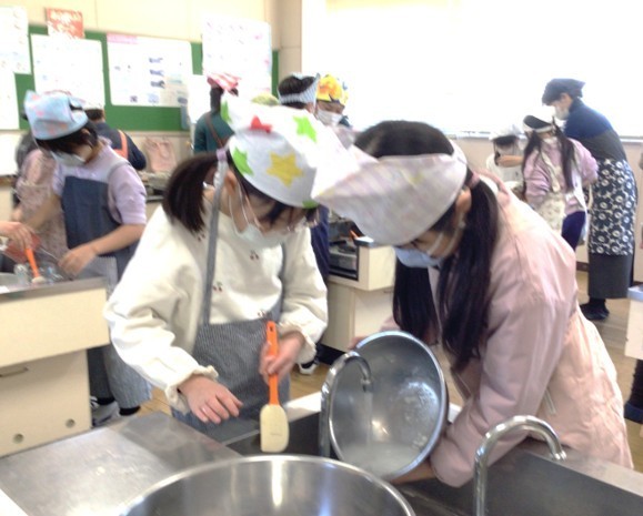 こちらは3年1組の豆腐作りの様子です。作業の合間に洗い物を進んで行うすてきな姿も見られました。