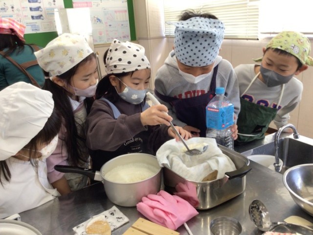 大豆栽培をしながら、大豆の秘密をいろいろと追究してきた3年生。今日は、待ちに待った豆腐づくりに挑戦しました。栽培アドバイザーの講師の方に教えていただきながら、グループで協力して作業を進めていきます。保護者ボランティアの方にも支えてもらい、形をどんどん変えていく大豆の様子に目を輝かせながら、夢中になって豆腐づくりに取り組みました。五感をめいいっぱい使って作り上げた「手作り豆腐」は格別の味でしたね。