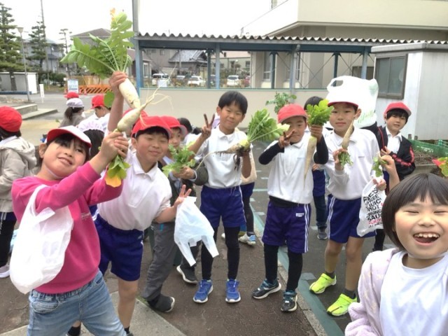 (写真上・中)2年1組・2組 生活科:大切に育ててきた大根をいよいよ収穫します。大小さまざまな大根に大喜びの2年生。「この大根はおでんにして食べるよ」「野菜スティックみたいにして食べたいな」自分が育てたからこそ、より愛おしそうに収穫した大根を大切に抱える2年生でした。