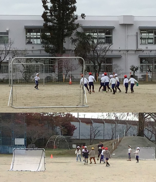 (写真下)2年3組 体育科:チームに分かれて、元気よくサッカーに取り組んでいます。勢いあまって転んでしまう場面もありましたが、さっと立ち上がり、ボールを追いかける姿にたくましさを感じました。
