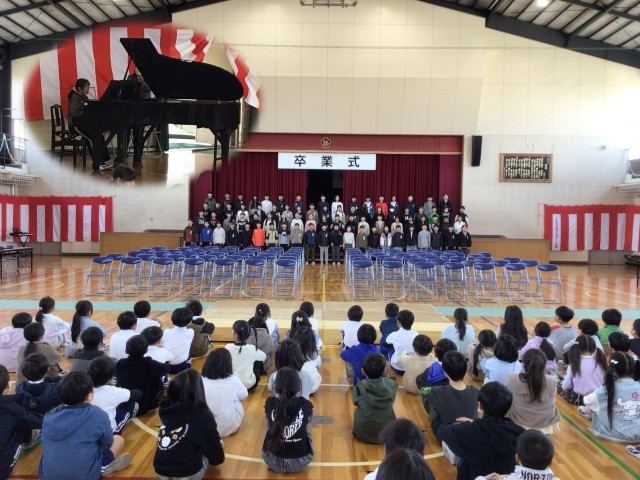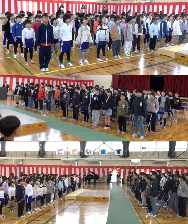 明日はいよいよ卒業式。前日の今日、卒業式に参列しない1・2年生が、一足先に6年生とのお別れの会を行いました。登下校にはじまり、学校生活の中のいろいろな場面で6年生とかかわってきた1・2年生は、大好きで、頼りになる6年生へ心からのありがとうの気持ちを言葉と校歌で送りました。6年生と一緒に歌った最後の校歌は、1・2年生にとって大切な思い出の一つになりました。