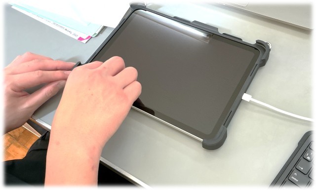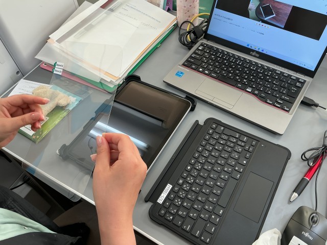 今年度から学習用タブレットが新しくなります。今日は、教職員で学習会を行いました。キーボードと一体化している型のため、扱い方でどのようなことに気を付けるかも共通理解を図りました。その後、教職員が個々に使うタブレット画面に保護シールを貼る作業を行いました。気泡が入らないように真剣に取り組む駒場小職員です。