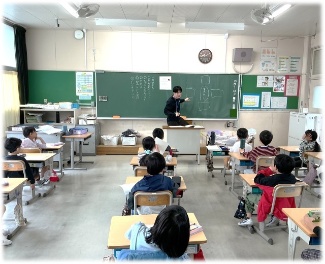 (写真下)2年2組 自己紹介カードにどんなことを書くのか、担任の話す例を参考に考えています。