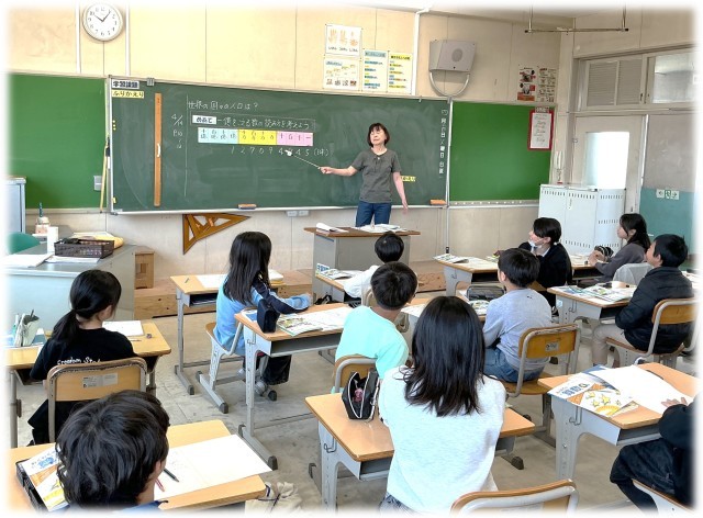 (写真上・中)4年1組 4年生は、今年度、算数科の学習において、1学級を2つに分けて、少人数で授業を進めていきます。学級担任と市サポートティーチャーが授業を担当します。少人数だからこその「分かる」「できる」を大切にした授業づくりを行っていきます。