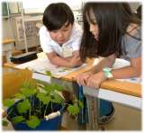 (写真上・中)4年1組 理科:ツルレイシの観察をしています。葉の数や見た目、香り...