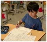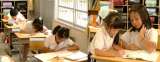 (写真上)2年1組 算数科・国語科:テスト問題に取り組んでいます。時間いっぱいま...