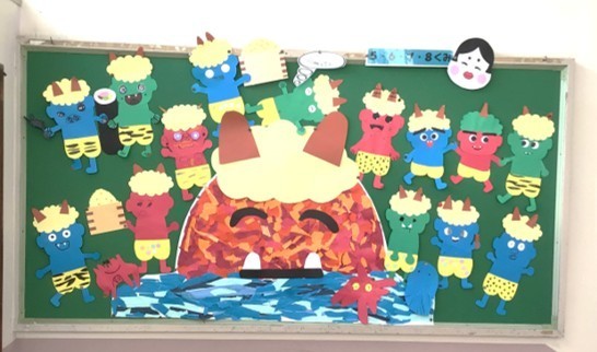 5678組の掲示板には、1月の初日の出がかわいらしい鬼の姿に変身し、子どもたちが作った表情豊かな小鬼たちが囲んでいます。節分の日には、節分豆を「鬼は外、福は内!」と言いながらまく習慣もありますが、こ...