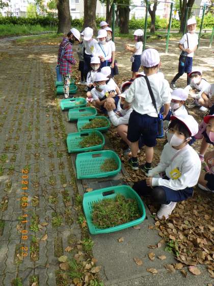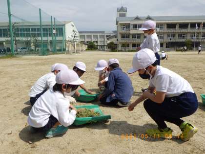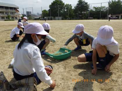 5月11日の1・2時間目に運動場の草取りを行いました。地面が固い場所もあり、根から抜くのは大変でしたが、時間いっぱいまで一生懸命作業をしました。自分たちが使う運動場がきれいになり、気分もすっきりしました。