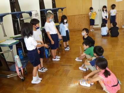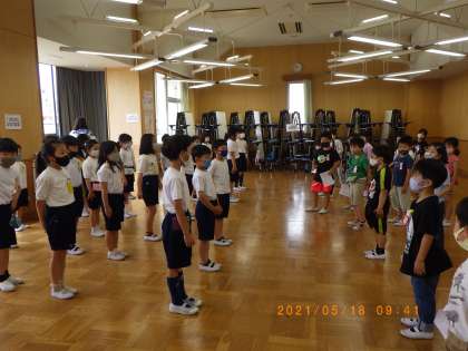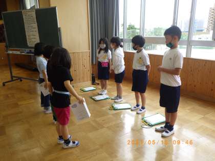 5月18日(火)の2時間目に、ランチルームにて1年1組と2年1組の交流会を行いました。生活科の学習で、2年生が1年生に挙母小学校の生活で大切なことを説明しました。1年生の前で緊張しながらも顔を見て話すことができできました。シールをプレゼントしてあげました。