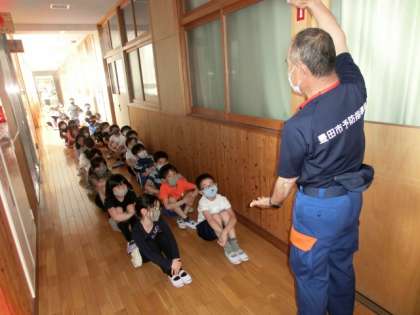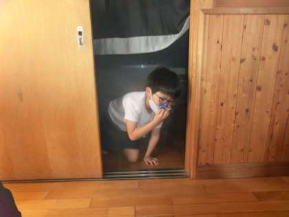 火災時の避難訓練の一環として、煙道体験を行いました。煙の中は真っ白で何も見えませんでしたが、安全に気を付けながら確実に避難ができました。子どもたちの防災意識も大いに高まりました。