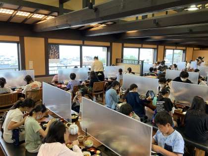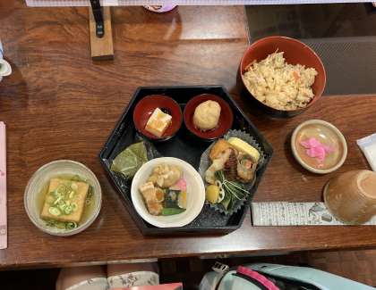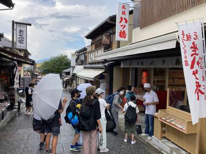 予定どおり、おかべ屋での昼食ののち、買い物タイムです。実は、清水寺の見学を終え、おかべ屋に入る直前に気の早い雨が降り出し、食事中は本降りでした。しかし、しかし、食事を終えて買い物となった途端に雨が止みました。この学年、持っています!午後もなんとか予定どおり見学できますように。