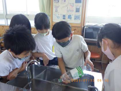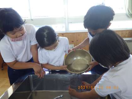 7月15日(火)の1時間目に、算数{かさ」の学習で、1リットルはどれぐらいか実際に水を計測しました。家庭科室にある様々な道具を使いました。ぴったり1リットルにするのはなかなか難しかったようですが、グループで協力して楽しく活動することができました。