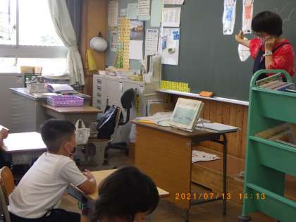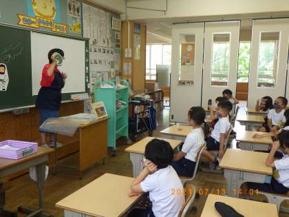 7月15日(火)の5時間目に、学校図書館司書による神話の紹介を聞きました。読み聞かせをを聞いたり、難しい部分の解説を絵を使って話してもらったりしました。挙母の地区に伝わる話もたくさん知ることができました。