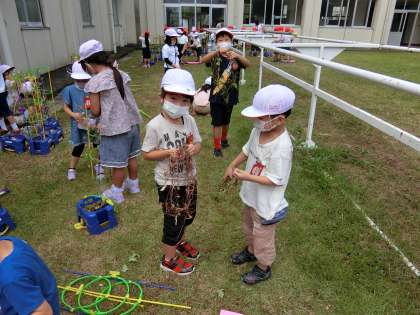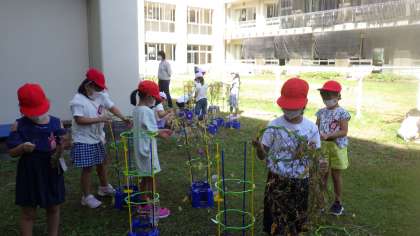 支柱に巻き付いたつるを取るのがとても大変でしたが、友達と力を合わせて取り、丸い形にすることができました。これから飾り付けを行います。どんなリースが完成するかが楽しみです。