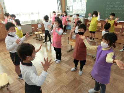 自己紹介をした後、「サラダでげんき」の発表を行い、まつぼっくりけんだまをプレゼントして一緒に遊びました。また、いっとうしょうたいそうを一緒に踊りました。一緒に楽しむだけでなく、お兄さん、お姉さんの表情になっていました。