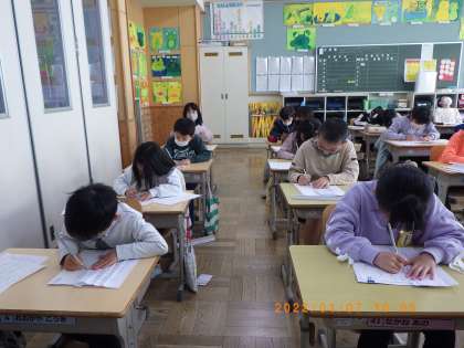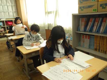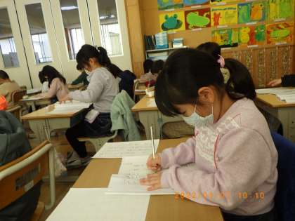 冬休み明け初日、校内書き初め大会が行われました。入賞を目指して真剣な表情で集中して用紙に向かう姿が見られました。どの子も1年生の時に比べ文字の形などが整い、上達していました。書き初め展を見学し、来年は毛筆でがんばろうと意気込んでいました。