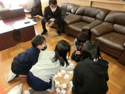 開校150周年記念の「挙母っ子かるた」のサンプルが出来上がりました。今日は校長室に3年生の代表児童4名が招かれ、その試遊会が行われました。校長先生の読み上げをしっかり聞いて、たくさんの札を取ることができました。