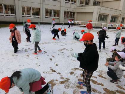 1年生は中庭で雪遊びをしました。足跡のついた雪のかたまりをうれしそうに持ち上げたり、小さな雪だるまを作ったりして楽しんでいました。