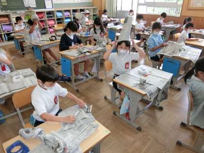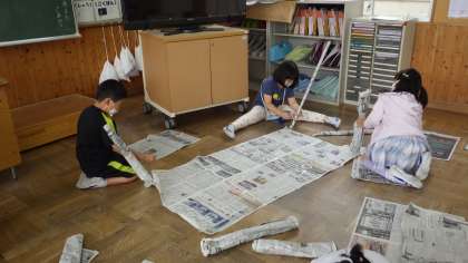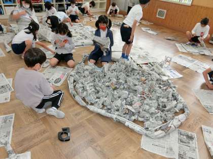 新聞紙をびりびり破ったり、ぐしゃぐしゃに丸めたり、子どもたちが思考を巡らせ、のびのびと遊びました。