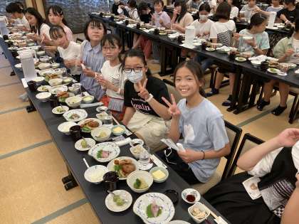 入館式と夕食の様子です。入館式では、司会の取り回し、代表の挨拶、とても立派でした。要所で自然と拍手が沸き起こる学年の雰囲気も素敵です。