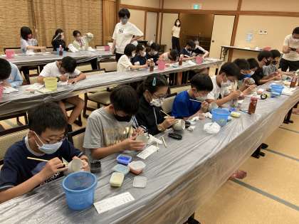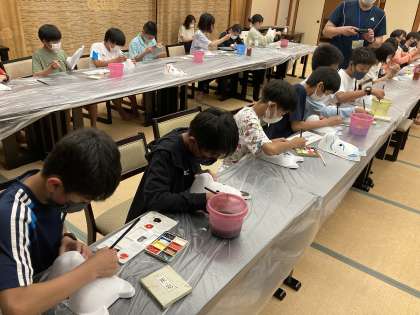 入浴を終え、20時から1日目最後の活動「伝統工芸体験」に入りました。念珠玉づくり、カップへの絵付け、狐面への絵付けの三つのコースから思い思いのメニューを選んで挑戦しています。講師の方の丁寧な指導もあり、力作ができそうです。カップ以外は持ち帰り、カップは後日送付です。お楽しみに。