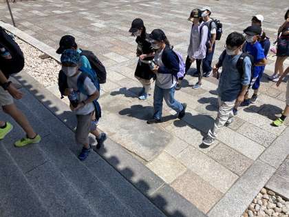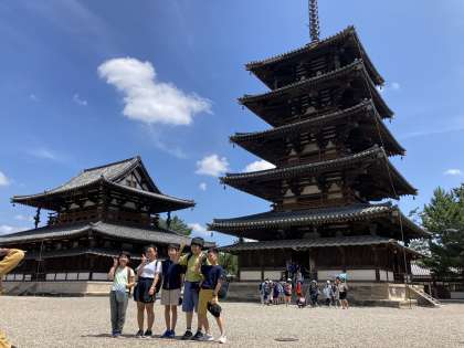 最後の見学地の法隆寺です。カレーを食べ、水難厄除けの「鯛石」を踏み、五重の塔の前で順にグループ写真撮影です。天気の良さが写真から伝わると思います。暑さを考慮し、説明はバスの中でしっかり聞き、見学は極力能率的に進めています。これで現地からの報告は最後とします。あとは、学校メールで帰着時間に関する連絡を数回予定しています。湾岸長島付近の工事のため、予定より遅れる可能性があります。メール情報にご注意ください。